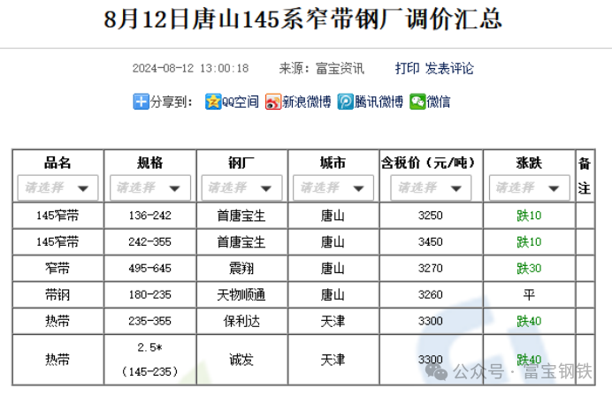 3.8月12日唐山145系窄带钢厂调价汇总: