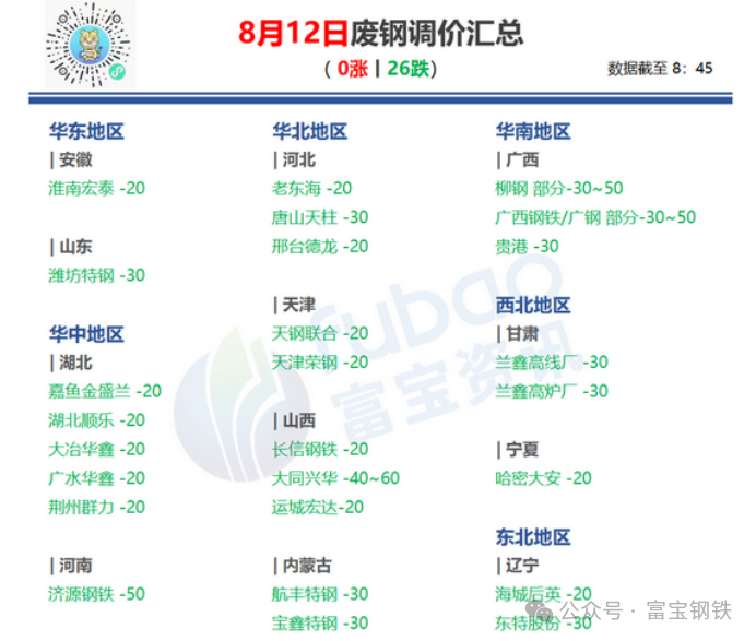 (4)废钢:12日国内废钢偏弱运行。截止当前在富宝跟踪报价的295家钢企中0涨76跌,跌价分布在各地区,跌幅20-100不等。目前影响废钢走势的因素有:1、钢坯和成品价格继续下挫;2、期螺大幅下跌,开盘逼近3200;3、焦炭第三轮提降落地,废钢走势受压制。整体来看,市场情绪普遍悲观,多加快出货节奏。加之考虑到国内持续高温,部分地区接下来会有强降雨,生产也会受到相应的影响。成品销售压力大,原料端承压下行,废钢支撑较弱,预测废钢仍将窄幅偏弱运行。